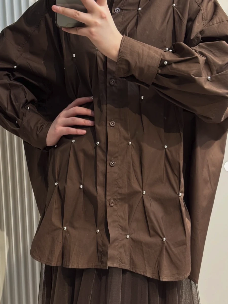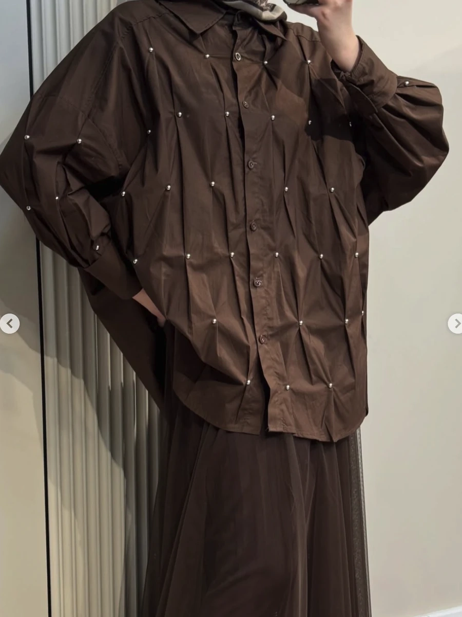 Рубашка женская удлиненная, коричневая, свободный крой, длинный рукав, декоративный декор